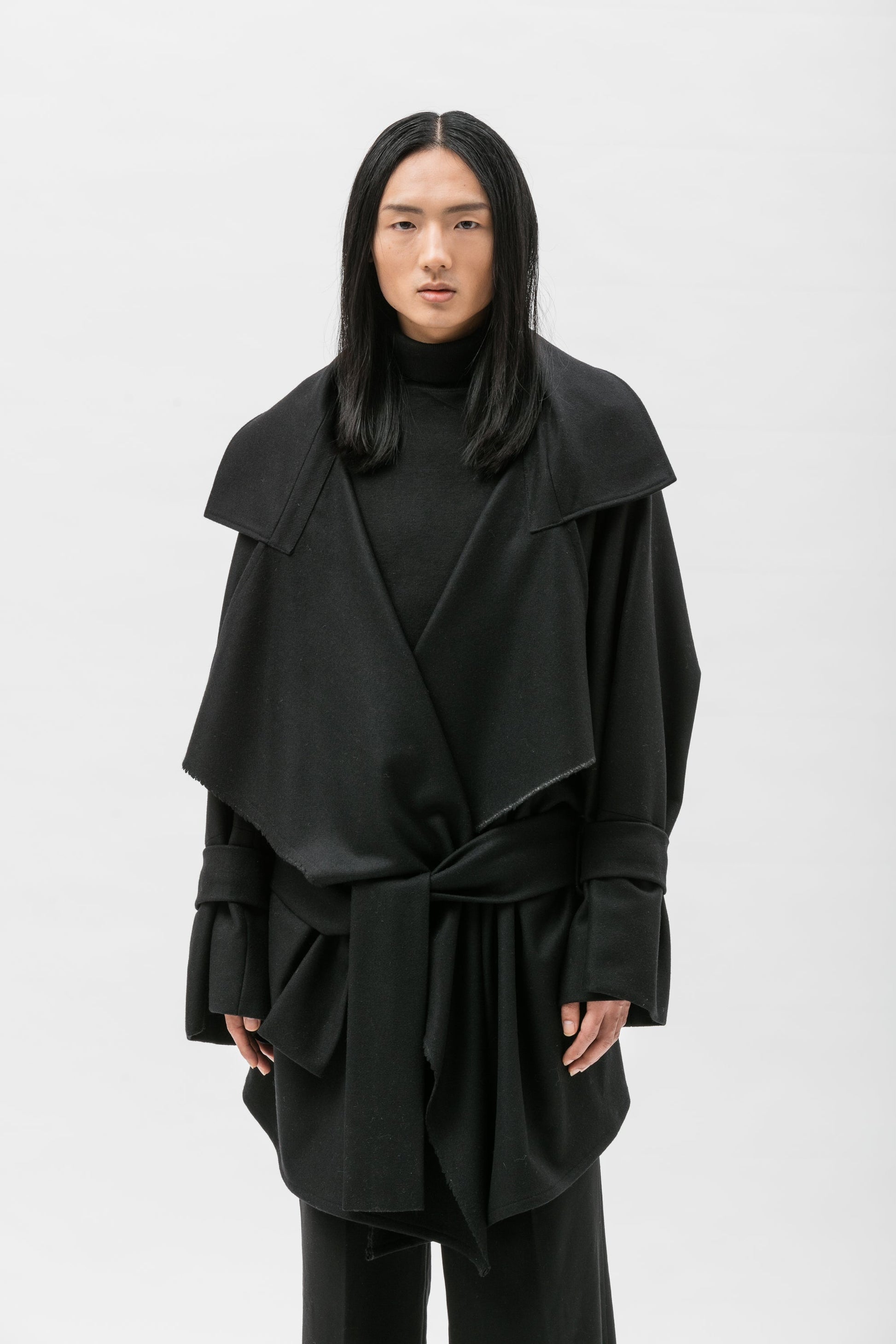 This oversized trench in recycled black is a timeless and genderless piece. Made in Italy with high quality materials it's developed making use of the distinctive zero-waste technique, speciality of ZEROBARRACENTO.