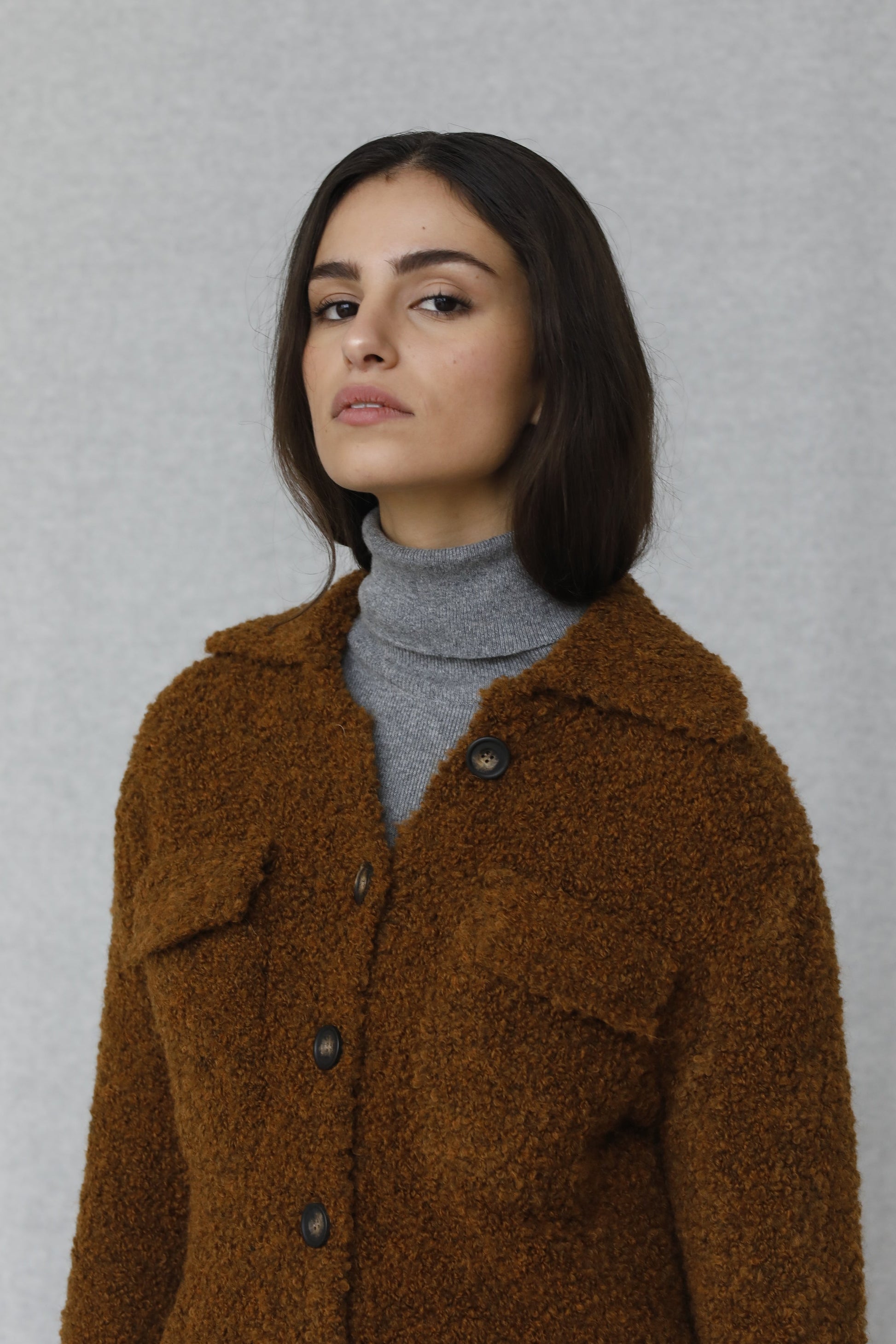 Bomber bouclè in maglia con colletto e taschine sul petto.