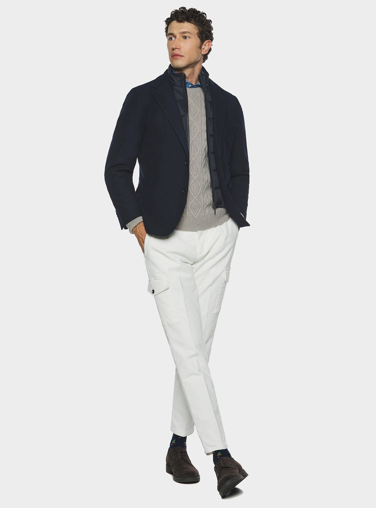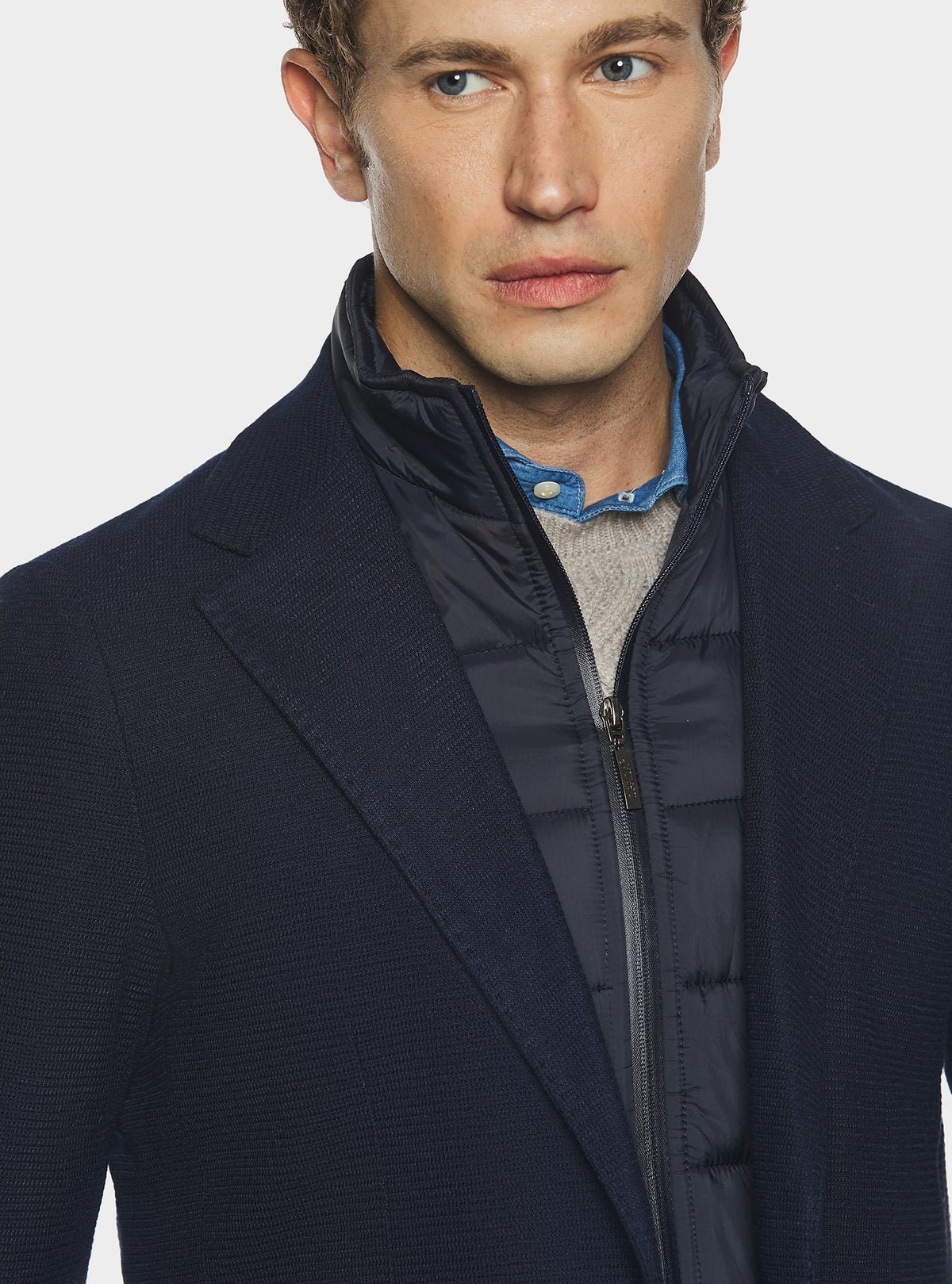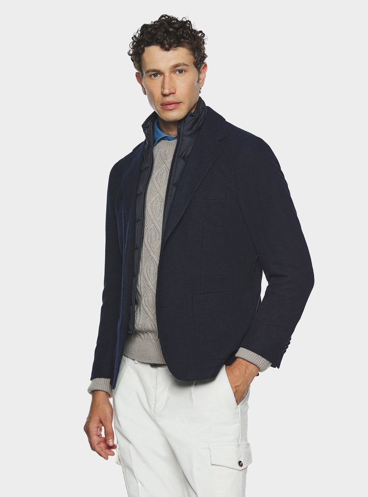 Giacca in jersey con pettorina imbottita removibile e chiusura a zip, perfetta per un look versatile e funzionale. Il design regular fit assicura una vestibilità confortevole e moderna, mentre la chiusura a due bottoni conferisce eleganza informale. Dotata di due pratiche tasche a toppa e un taschino a filo sul petto, unisce stile e praticità. La pettorina imbottita, facilmente rimovibile, aggiunge un ulteriore strato di protezione per le giornate più fresche. Il modello in foto indossa la taglia 50 ed è alto 188 cm.