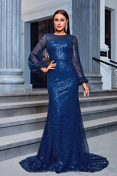 Indulge in the luxurious and exclusive JM201. This navy masterpiece boasts a siren line silhouette and dazzling glitters for a show-stopping look. With long sleeves, a high neck, and an illusion neckline, this dress is both sophisticated and alluring. The back is elegantly covered, adding to the overall allure. Elevate your style with JM201.