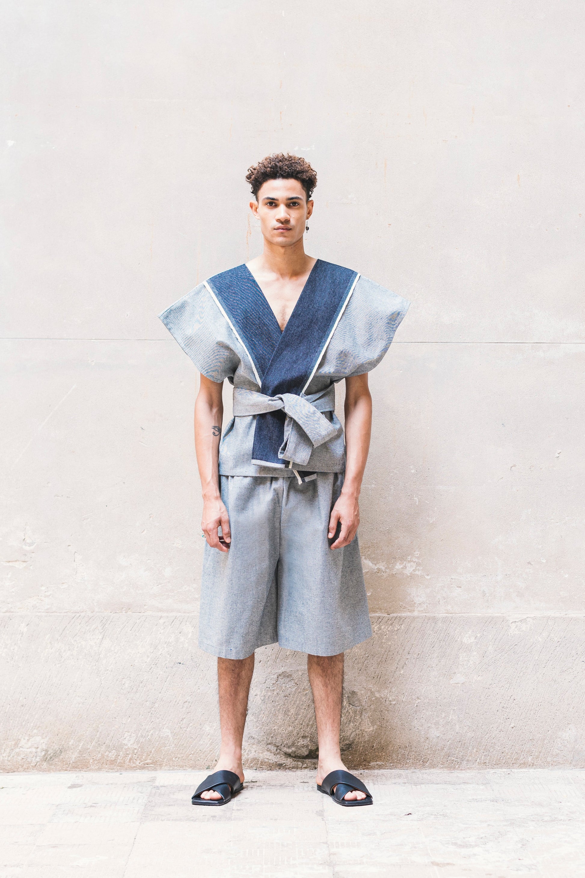 Our KARATEGI denim short kimono has minimalist shapes, designed to wrap the whole body. Made in Italy with high-quality materials, it has been designed making use of the distinctive zero-waste technique, a special feature of ZEROBARRACENTO.