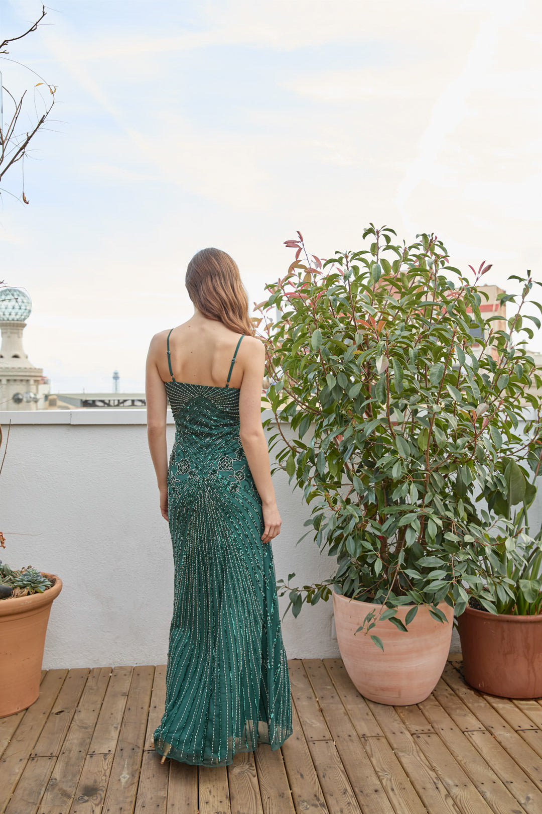 Vestido largo de fiesta en verde con pedrería bordada y escote en V. Un diseño sensual y sofisticado que destaca por su silueta entallada, tirantes finos y espalda descubierta. Todo el vestido está cubierto con pedrería delicadamente bordada, creando una pieza luminosa y elegante. Perfecto para invitadas que buscan un look impactante y cómodo a la vez. Confeccionado artesanalmente en España con atención al detalle.
