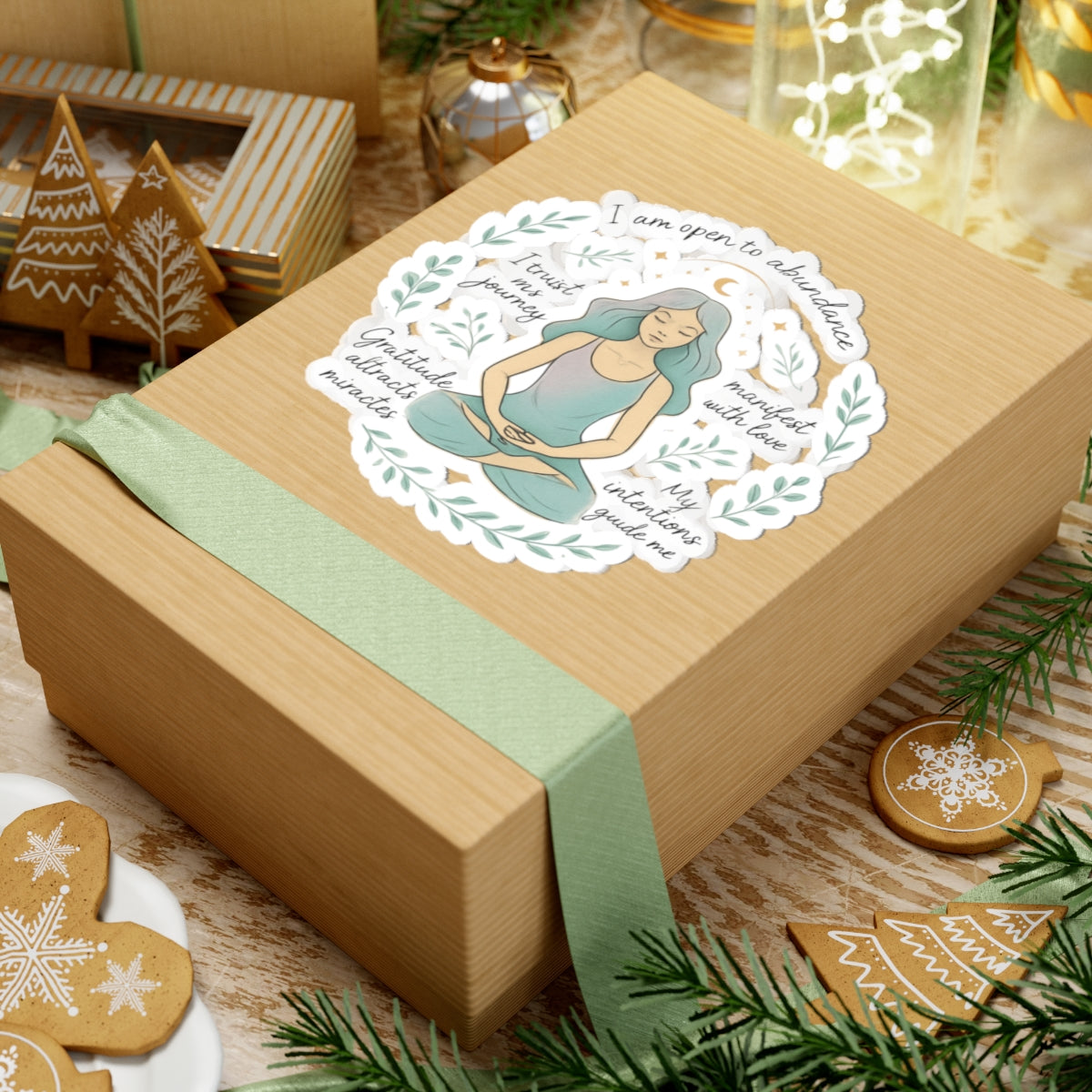 Soft, soothing energy captured in a small, meditative sticker. This kiss-cut vinyl piece shows a seated figure surrounded by leafy laurel wreaths and gentle affirmations — short phrases that invite calm, trust, and a daily nudge toward mindful abundance. Colours are muted greens, warm neutrals, and soft teal, giving a tranquil, organic feel that blends into laptops, journals, water-bottle bottoms, or altar boxes. The glossy finish adds a subtle sheen that makes the artwork glow while protecting the print from everyday scuffs. Use it as a quiet reminder during a busy day or as a layered accent among other stickers on your favorite gear. Product features - Glossy paper finish with scratch-resistant surface - Durable 100% vinyl with permanent acrylic adhesive (not waterproof) - Printed in vivid eco-solvent inks for bright, lasting color - Available in white or transparent backing and four size options - Quick, bubble-free application; requires transparent PNG for kiss-cut Care instructions - Use a soft, clean and dry cloth to gently brush any dust or dirt off from the center of the sticker outwards.