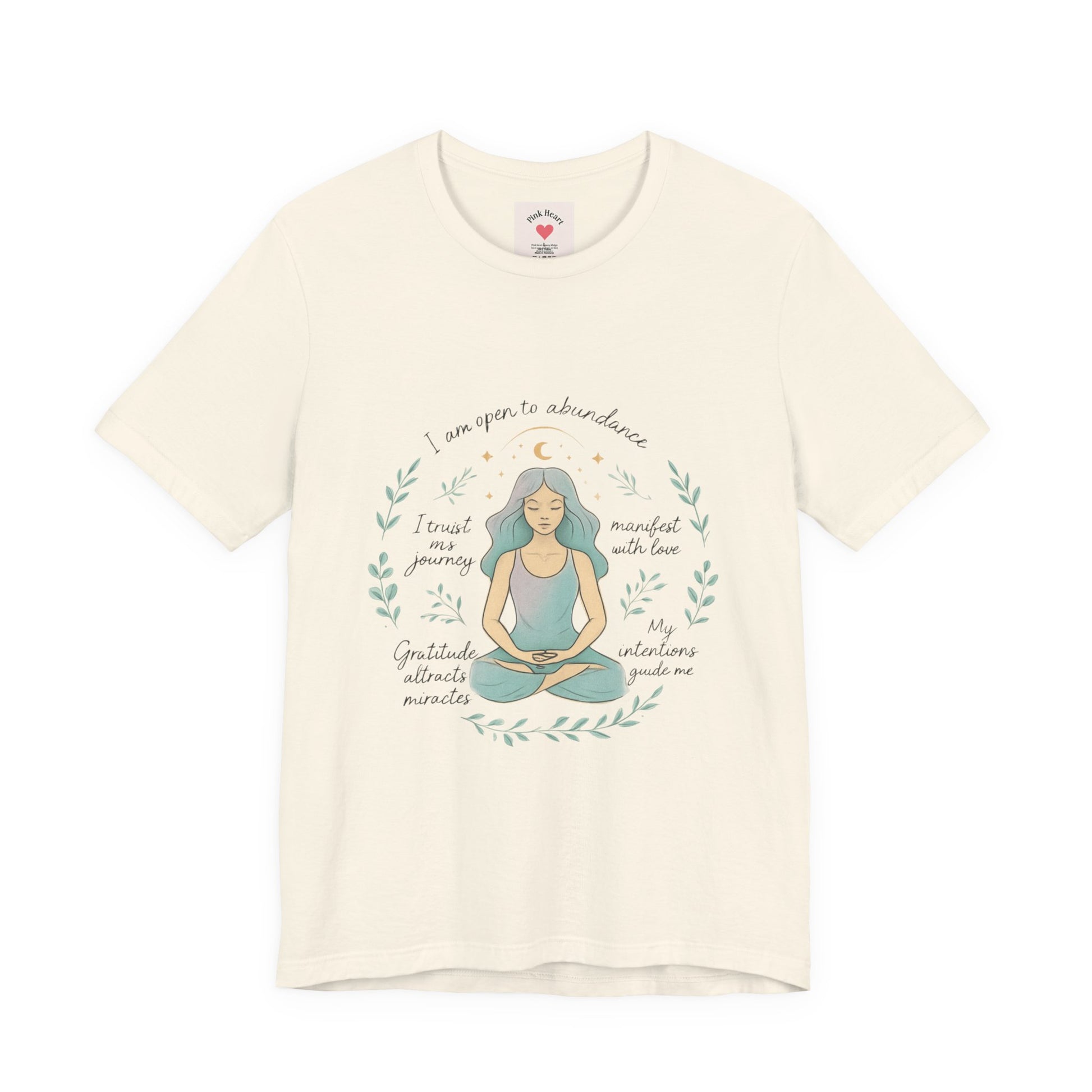 A soft, lightweight cotton tee that channels calm and intention. The front illustration shows a serene figure seated in meditation surrounded by leafy accents and gentle affirmations—an invitation to slow down, breathe, and carry quiet confidence through the day. The retail cut and crew neckline make it easy to layer under cardigans or wear solo during yoga, journaling sessions, or relaxed mornings at home. Subtle, earthy tones keep the look understated so the message reads as personal and grounded rather than loud or flashy. Product features - 100% Airlume combed and ring-spun cotton (Bella+Canvas 3001) — lightweight and breathable - Side seams and shoulder tape for lasting shape and reduced stretching - Ribbed knit collar with seam and tear-away label for comfort - Sleeve and neck label printing use DTF/DTG methods for crisp, vibrant details - REACH certified; ethically manufactured (Fair Labor Association, Platinum WRAP) — blank sourced from Honduras Care instructions - Machine wash: cold (max 30C or 90F) - Non-chlorine: bleach as needed - Tumble dry: low heat - Iron, steam or dry: medium heat - Do not dryclean