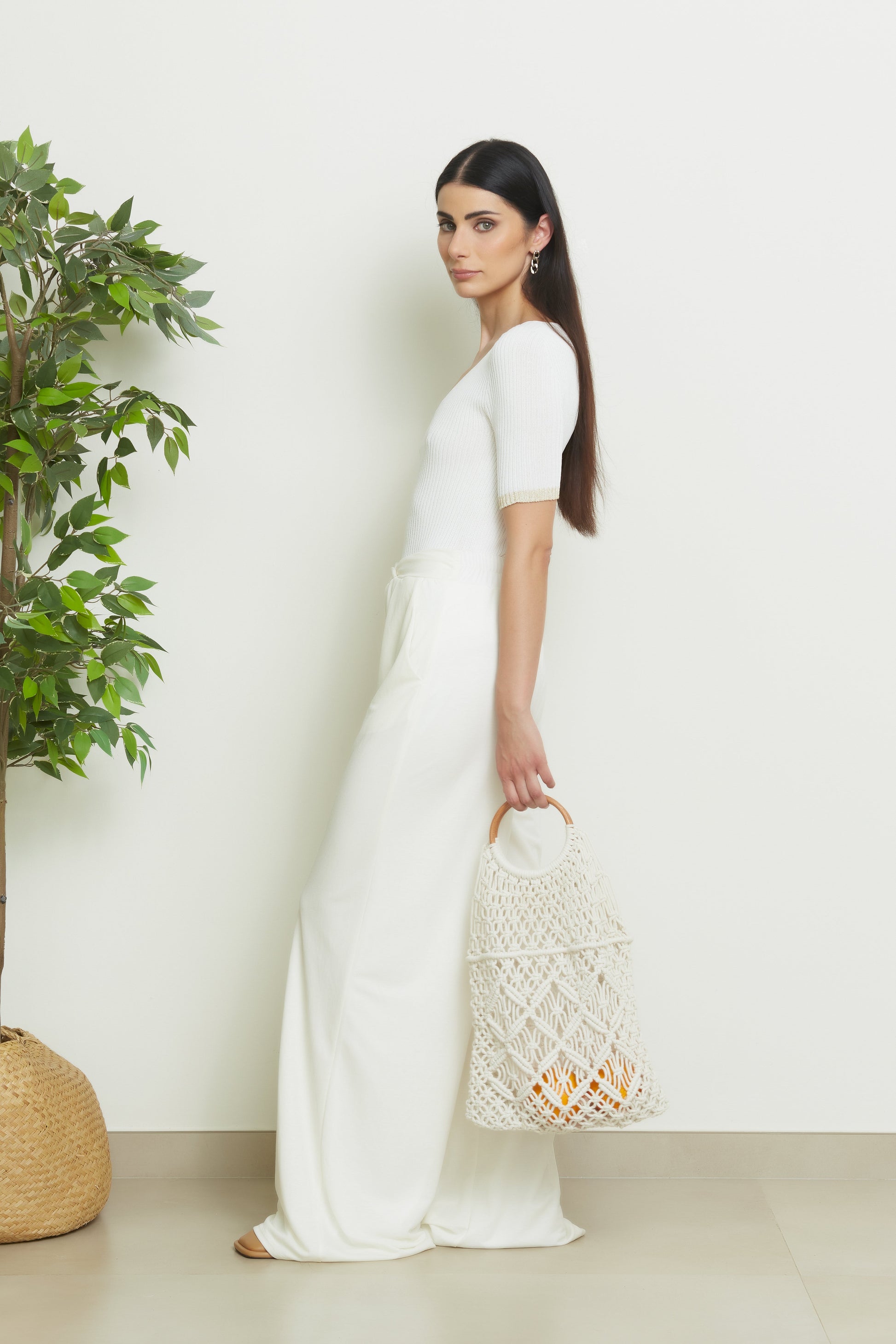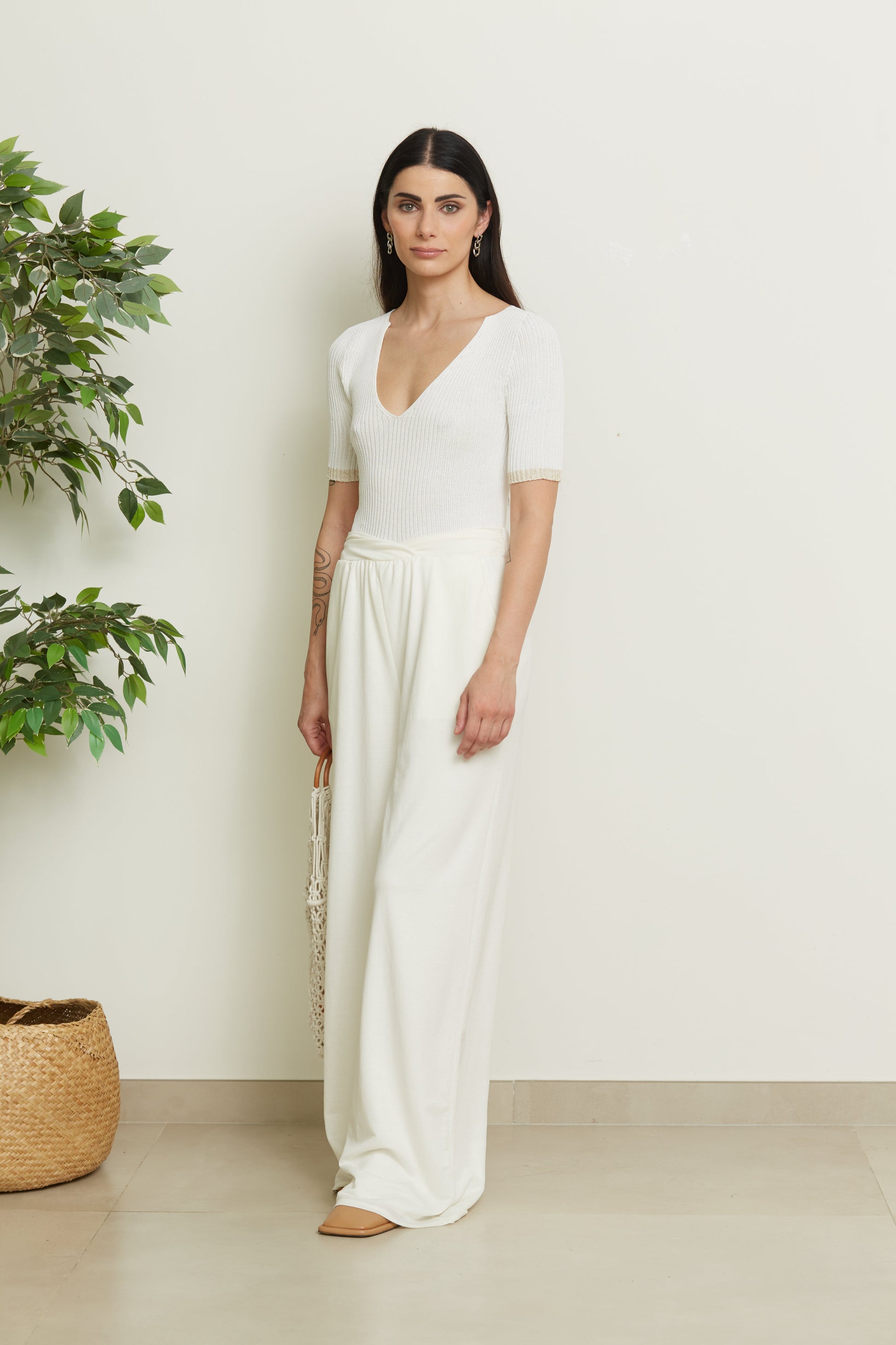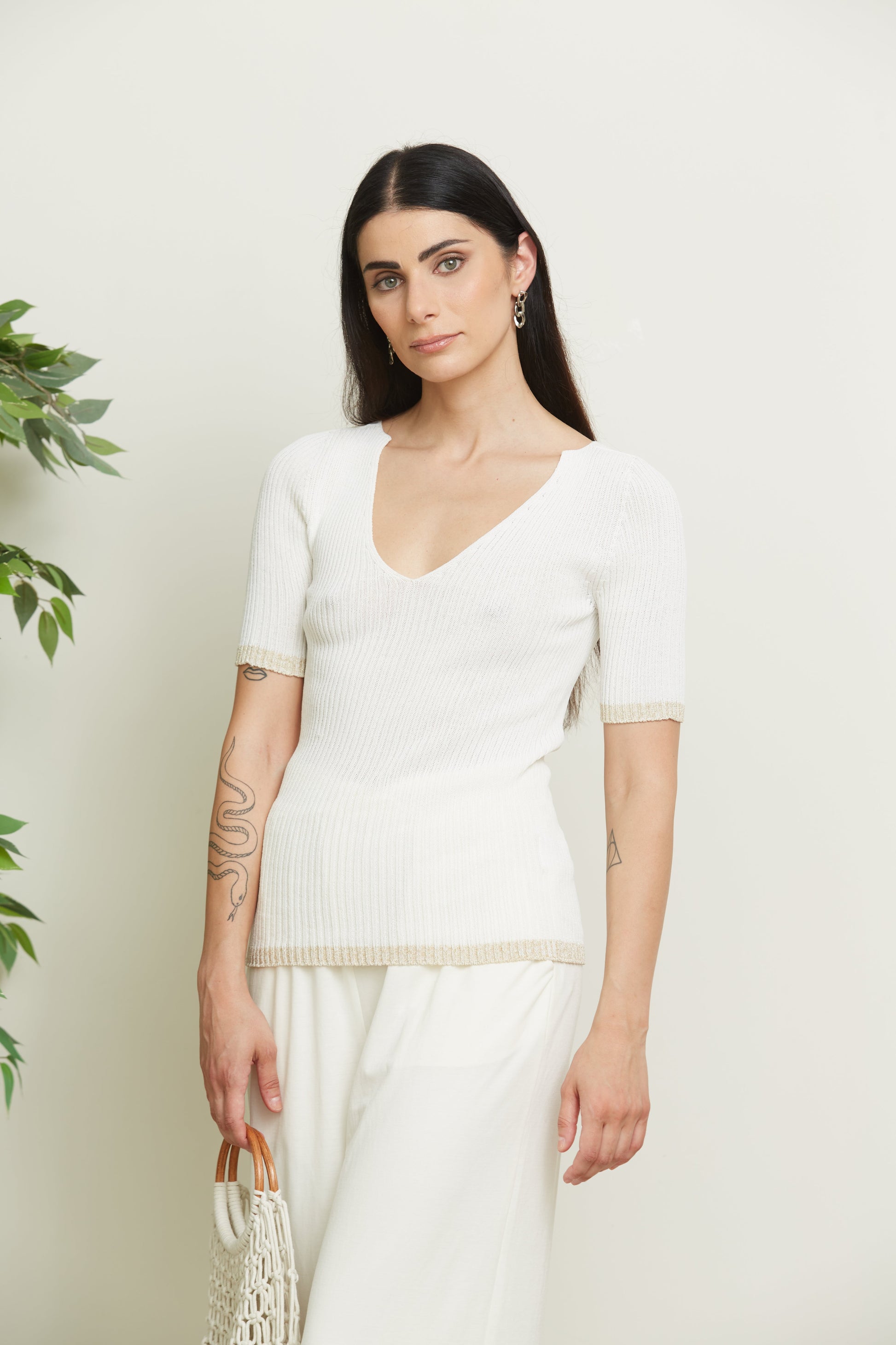 Top scollo a V, mezze maniche in viscosa a costine e dettaglio color oro su fondo maglia e maniche. Interamente realizzata senza cuciture.