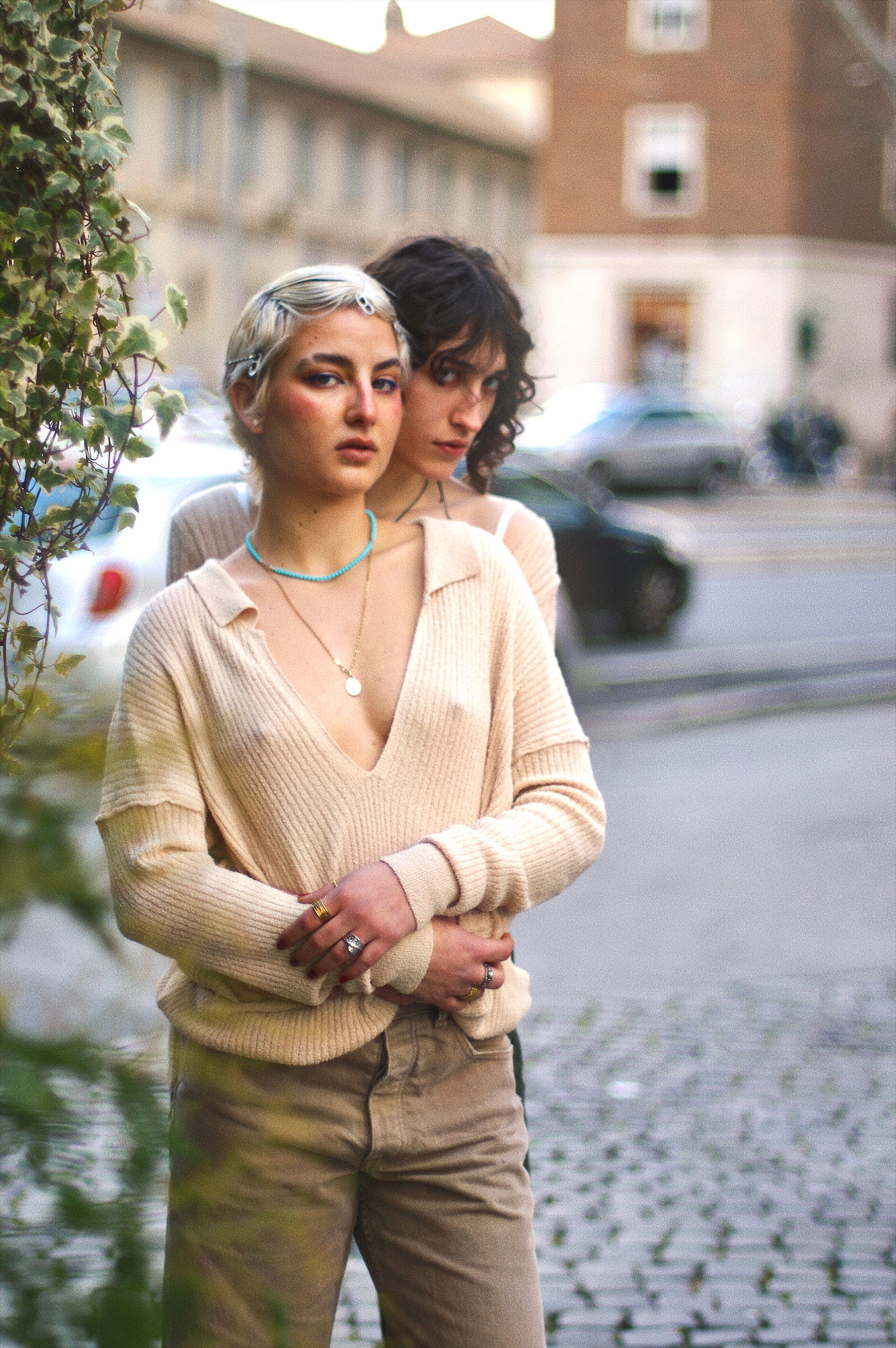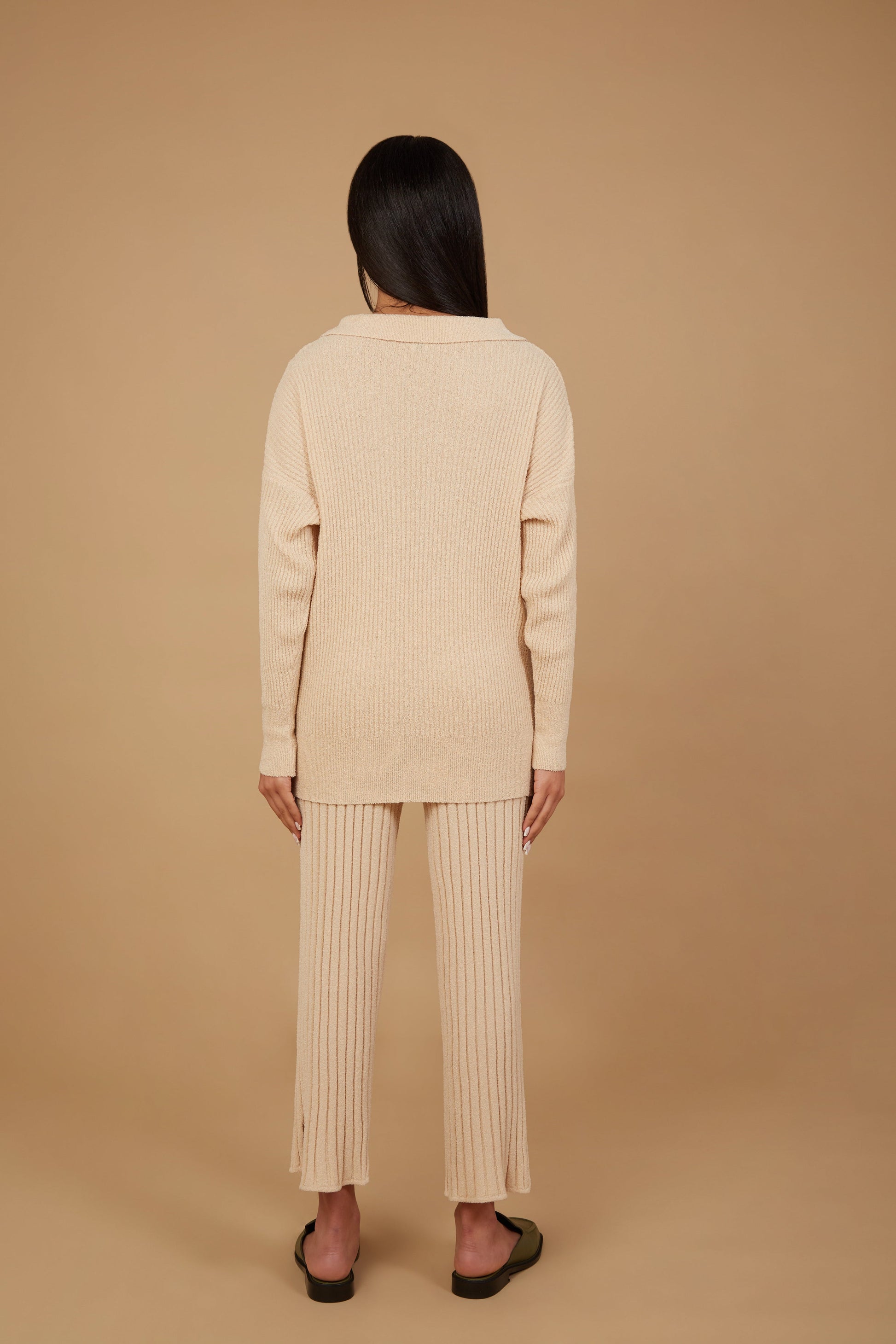 Con costine lavorate, scollo profondo a V e colletto morbido. La maglia si presta per essere sblusata o indossata full-lenght a seconda dell'esigenze e body-shape.