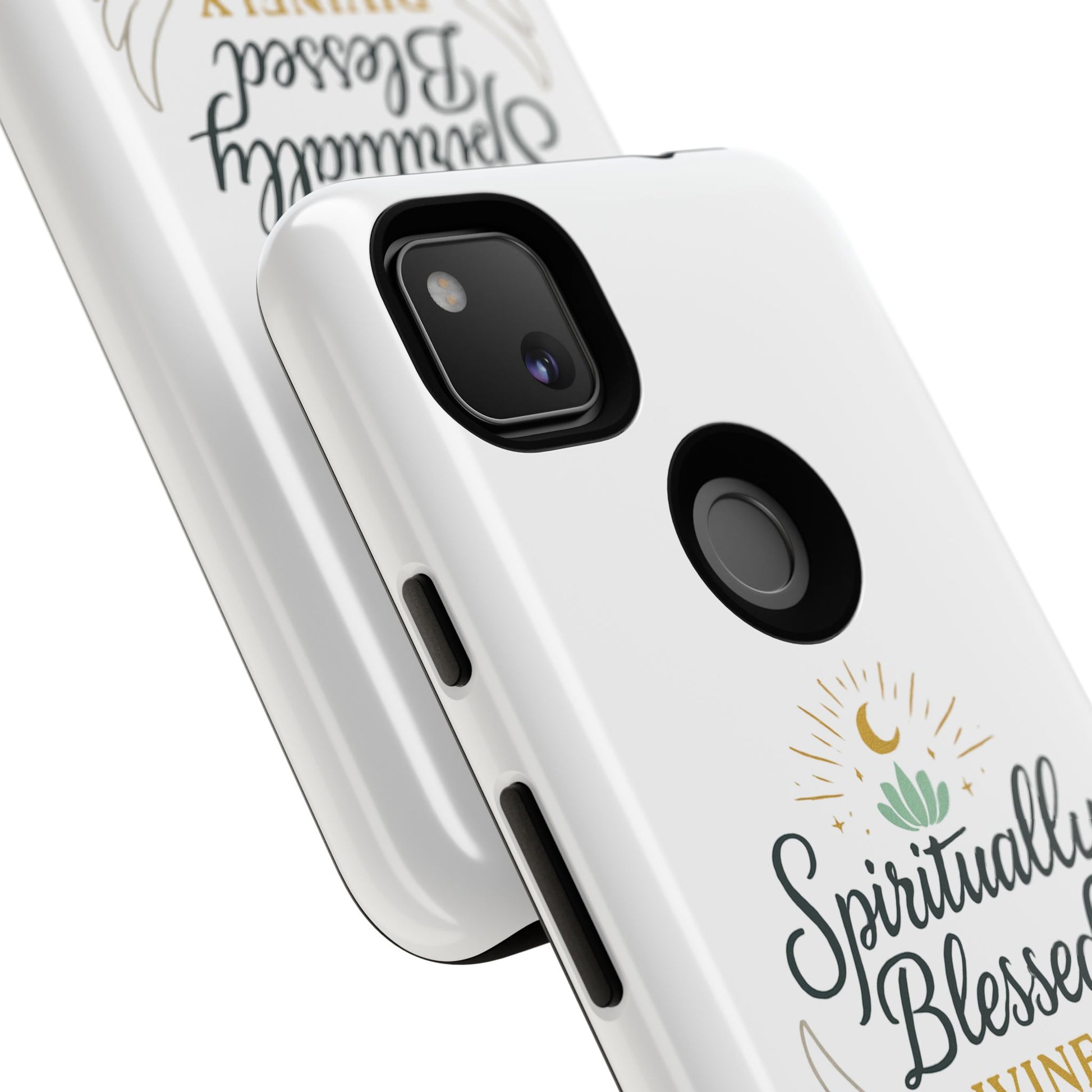 Carry a quiet reminder of faith and calm with this protective phone case. Soft gold accents and gentle wing motifs frame the hand-lettered phrase “Spiritually Blessed – Divinely Guided,” creating a peaceful, uplifting look that sits subtly on a white background. The case feels smooth in the hand, and the dual-layer construction keeps your phone safe while letting the message remain visible through daily life — a little talisman you touch dozens of times a day.