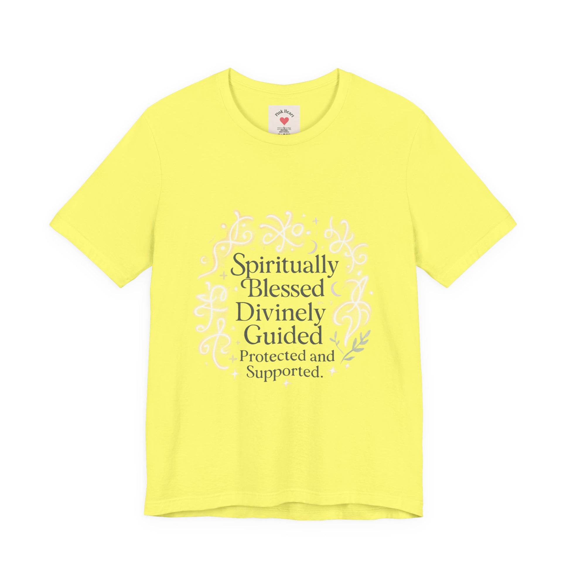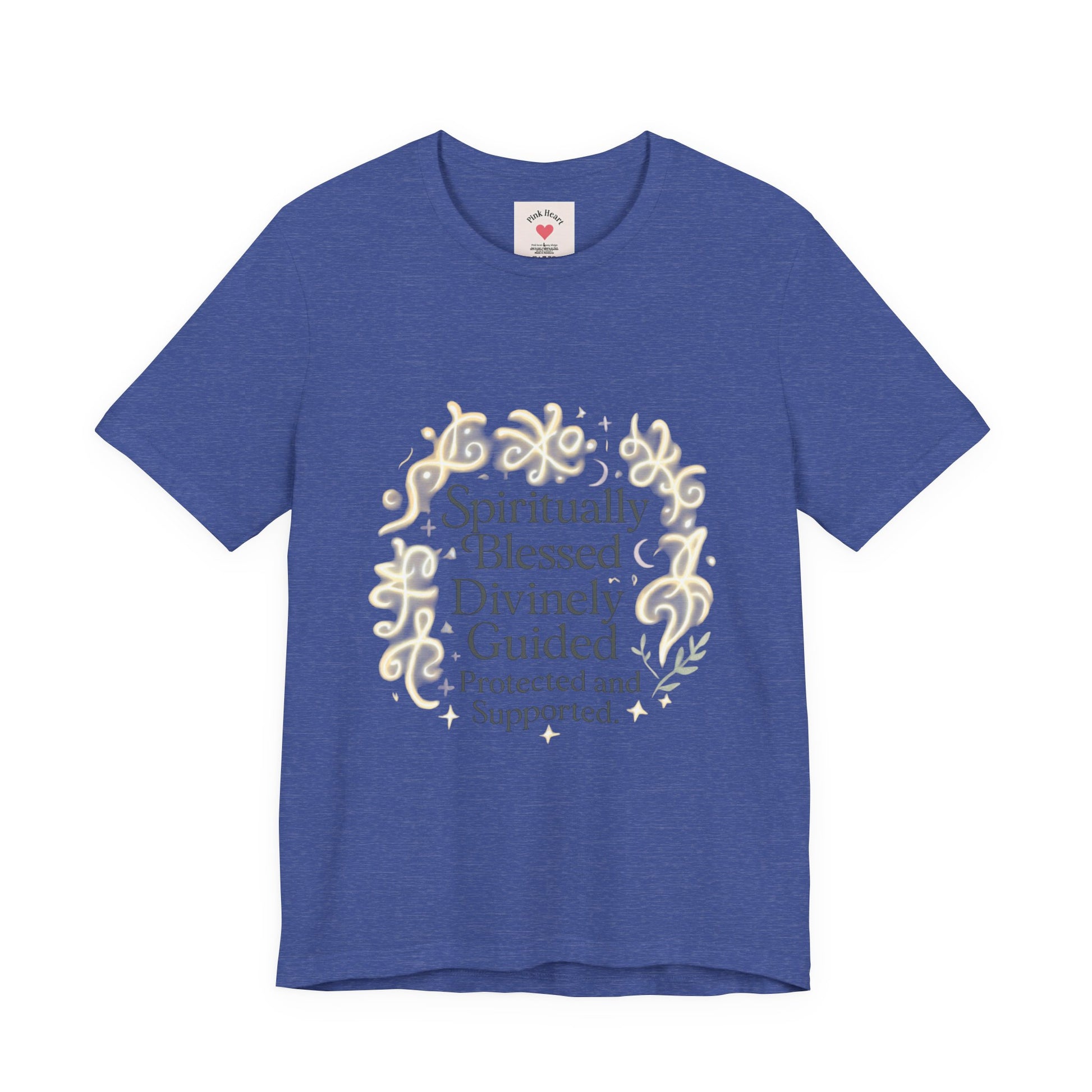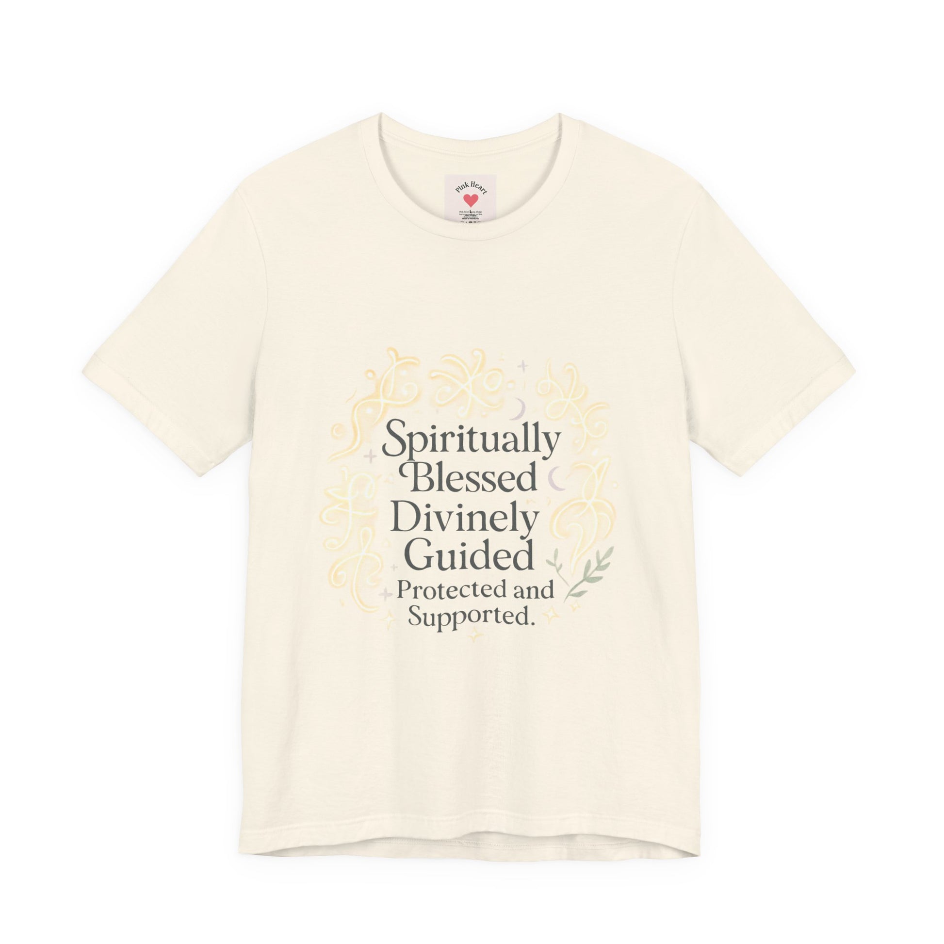 A soft, breathable tee that carries a quiet reminder of faith and calm. The lightweight cotton sits close to the body without constricting, and a delicate, sunlit floral motif frames gentle affirmations: “Spiritually Blessed / Divinely Guided / Protected and Supported.” It reads like a whispered prayer you can wear—comfortable for slow mornings, community gatherings, or days when you want a subtle spiritual anchor. The crew neckline and retail fit keep the look tidy for layering under a cardigan or pairing with jeans. Ethically made and REACH certified, this shirt blends conscious production with easy, everyday wear. Product features - 100% Airlume combed ring-spun cotton (lightweight 4.2 oz) for breathability and soft hand feel - Side seams and shoulder tape for improved shape retention and stable fit - Ribbed knit collar with seam and tear-away label for comfort and long-lasting neckline - DTF/DTG printed sleeves and neck label options for crisp, vibrant print details - REACH certified; Bella+Canvas responsibly manufactured with global fair-labor certifications Care instructions - Machine wash: cold (max 30C or 90F) - Non-chlorine: bleach as needed - Tumble dry: low heat - Iron, steam or dry: medium heat - Do not dryclean